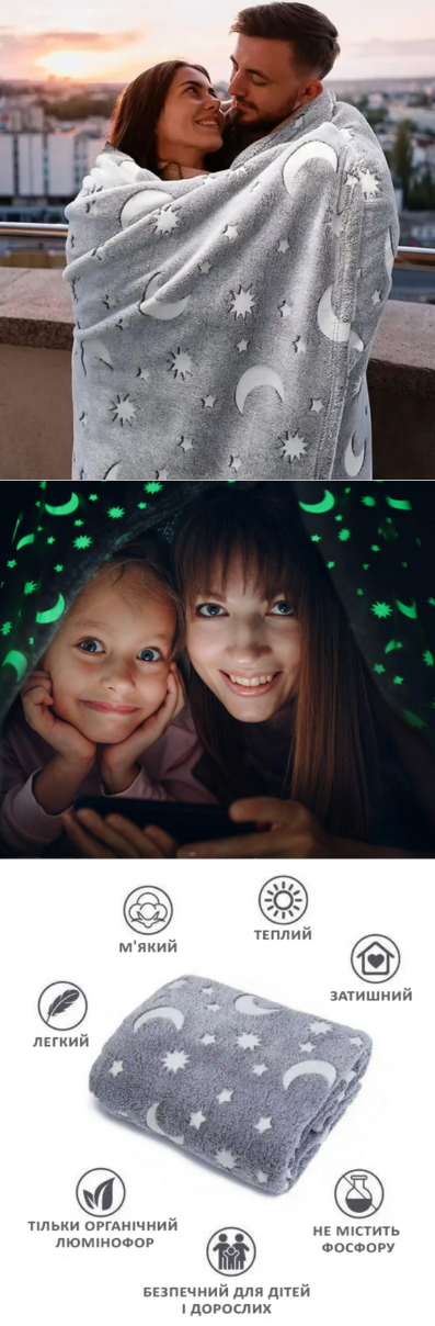 Я не перебільшую, коли кажу, що це найм'якша ковдра, яка в мене колись була. Світіння у темряві теж справді дуже хороше. Рекомендую!